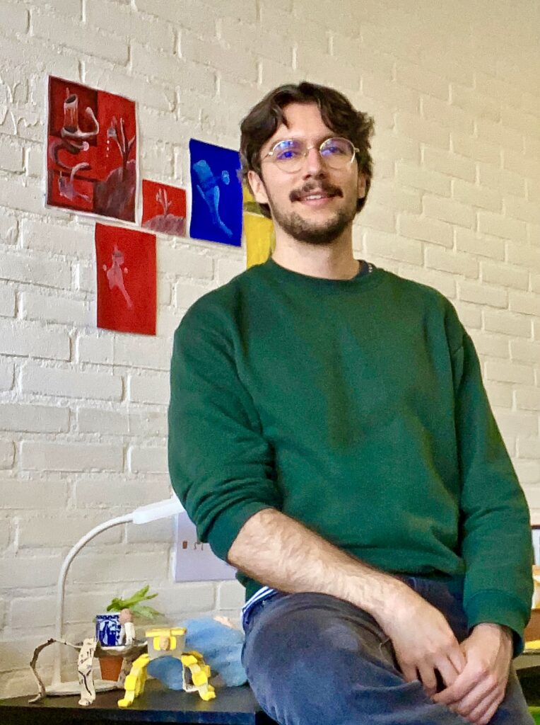 Kas’ artistic practice blends art, storytelling, and character design. His work embraces the clumsiness of the human body and explores our complex relationship with tools and objects with a playfully surrealistic style.