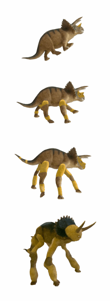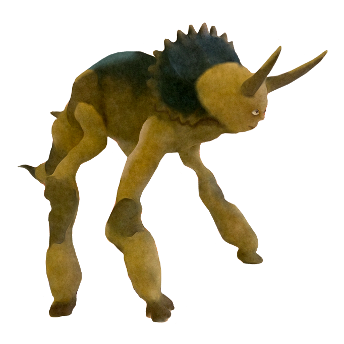 The first successful species of Plastijurrea bears a striking resemblance to the former Triceratops. Brutal and powerful, they are fiercely territorial. With thunderous clashes, they ram their sharp horns into one another in displays of dominance. The vast grasslands they roam are just as artificial as the Plastijurrea themselves—blades of plastic that crackle underfoot. The creatures tear them apart with their massive jaws, yet the fields regrow just as fast, as if the land, too, refuses to go extinct.