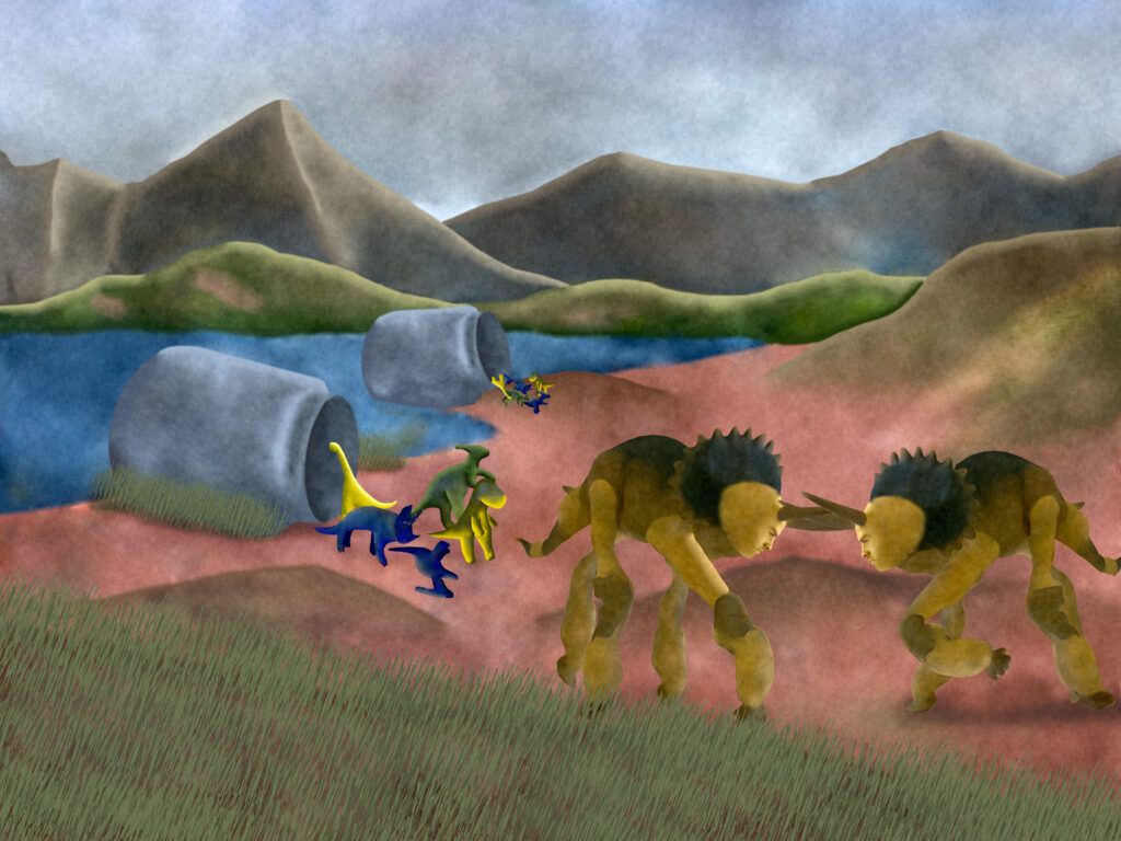 Enormous plastic vats have settled in the bay of a lake deep within the grasslands. They are filled with plastic molded into the shapes of dinosaurs—creatures that vanished from the Earth millions of years ago. Now, their synthetic descendants are reclaiming ancient territory. These vats act as breeding grounds, plastic greenhouses from which new species crawl into the world. Evolution is happening rapidly here—faster than ever before. It’s as if the plastic dinosaurs are seeking revenge for their long-ago extinction.